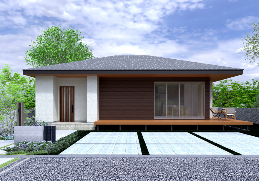開放的な空間とスムーズな生活動線が魅力の老後も安心して暮らせる平屋住宅。ウッドデッキや中庭付き、子育てに最適な間取りなど、ライフスタイルに合わせた多彩なプランをご用意しています。