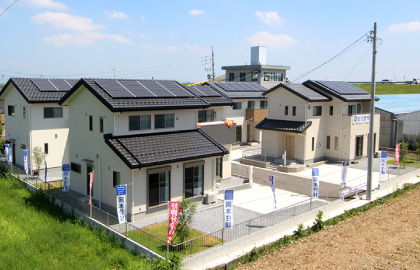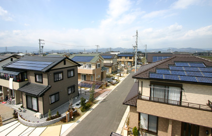 「ソーラーエコタウン」販売開始世間で環境問題に関心が高まり始めた頃、岡本住建では毎日を過ごす「家」にこそ地球環境を考えた新しい形が必要と考えました。そして東海地区で初めて、全区画太陽光発電&オール電化の街「ソーラーエコタウン」の販売を開始しました。