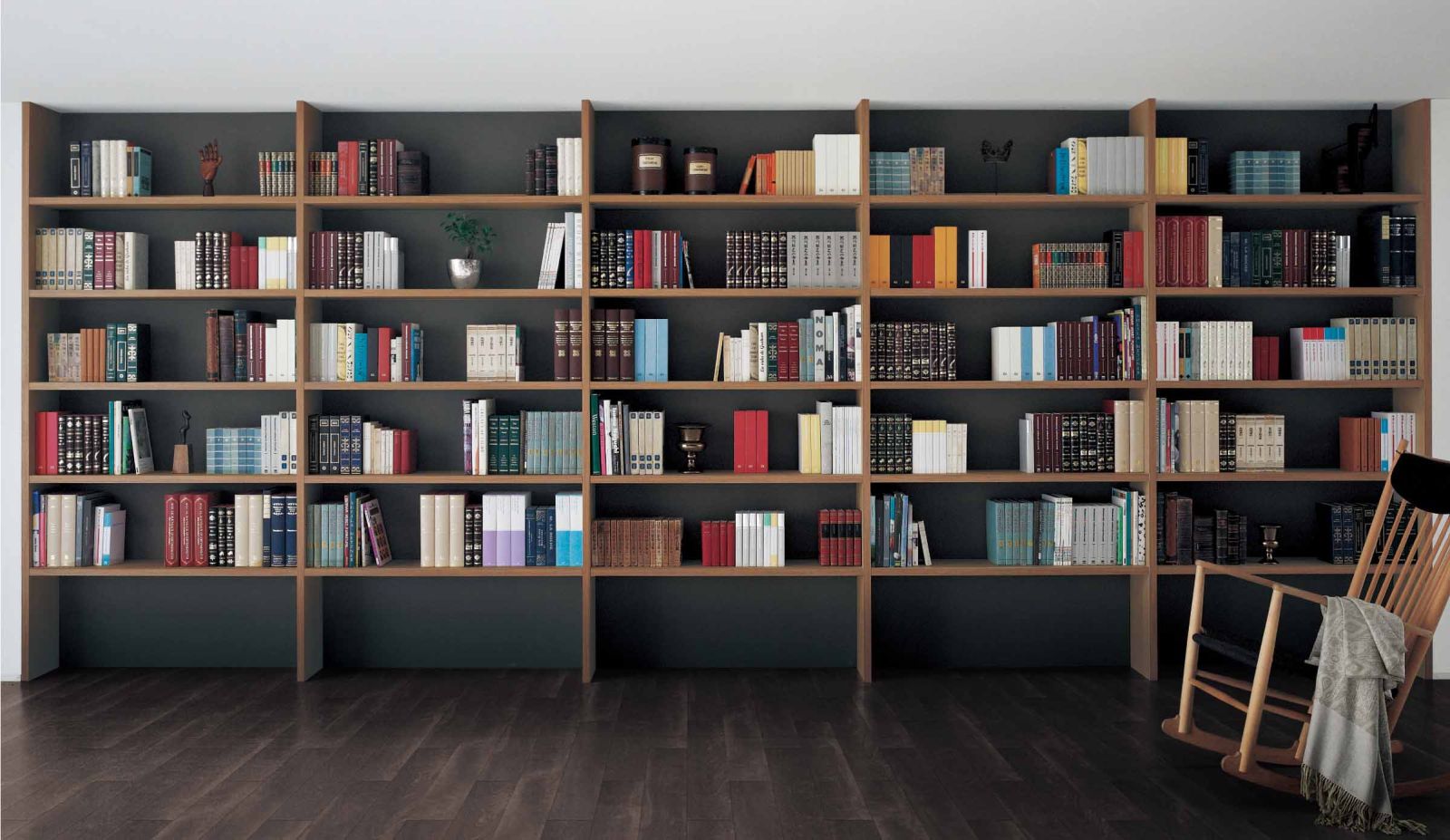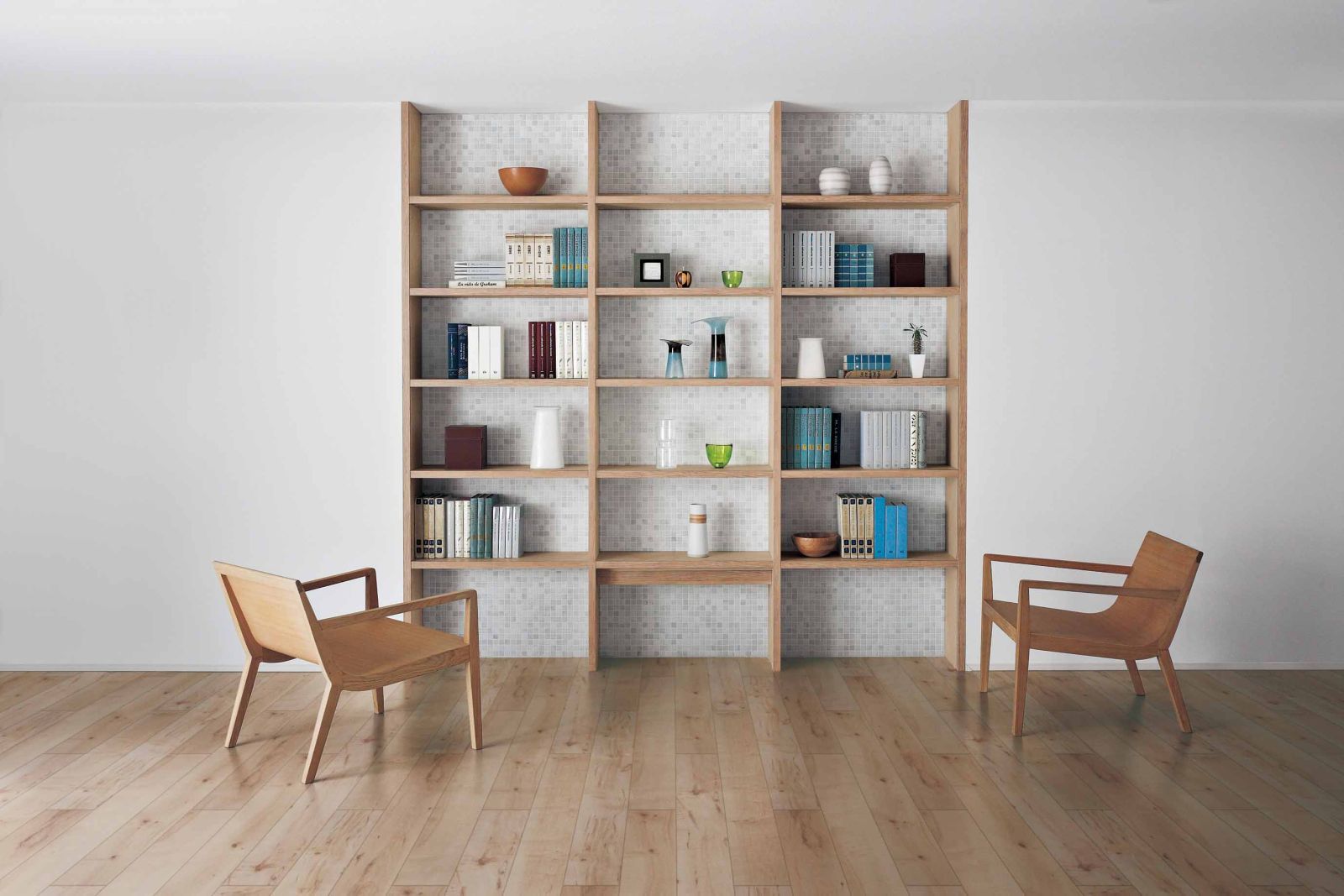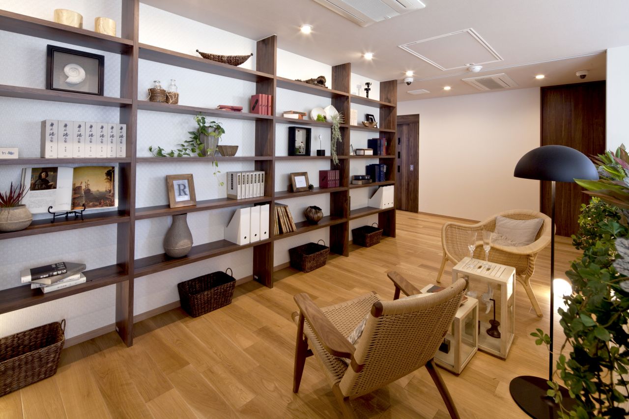 壁一面の造作本棚と、必要な場所にあるオープン収納。