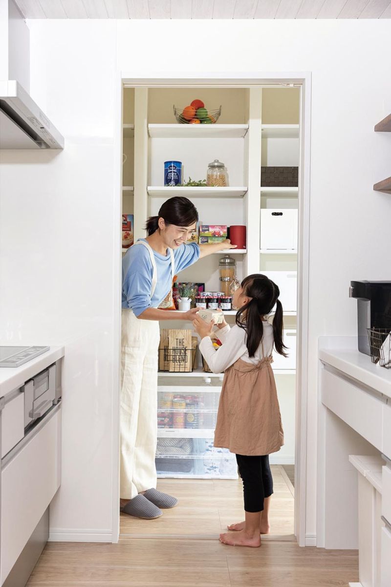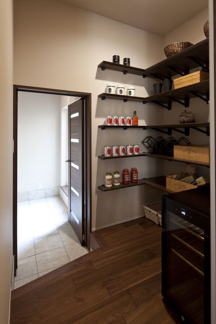 勝手口から、納戸、パントリー、ランドリールーム、脱衣室、お風呂までが一直線。