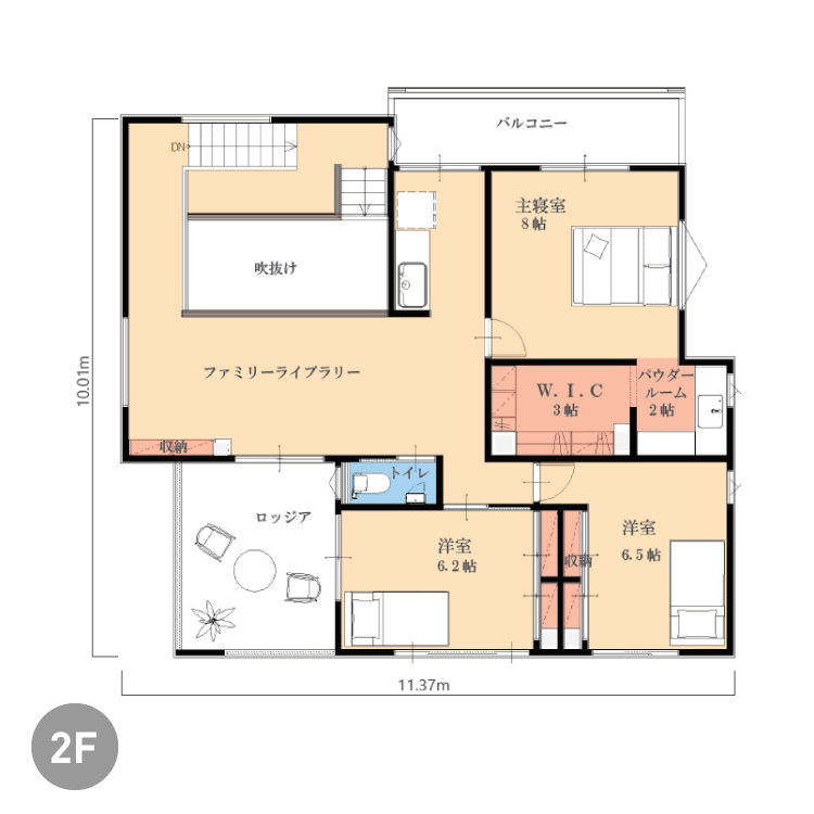 テクノストラクチャーだからできる、オリジナル接合金具を採用した梁勝ち構造によって、天井高2.6mのワイドリビングを実現しました。