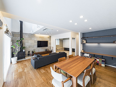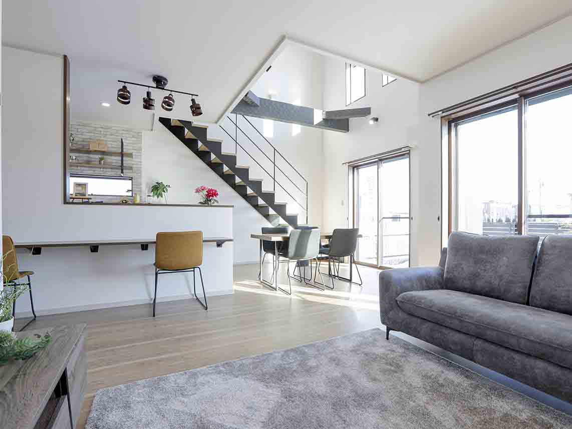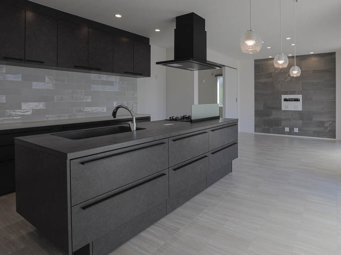 シックな黒の外壁に直線的なデザインがスタイリッシュな外観。重厚感のあるグレーのキッチンに深みのある木目の床が高級感を演出。個性的な照明やアクセントクロスで現代的な印象をプラスしたモダンなインテリア。コの字の家の中心には、リゾート気分が味わえる中庭を設置。目隠しの黒の格子がファサードを彩るアクセントに。内も外もスタイリッシュモダンを極めた平屋。
