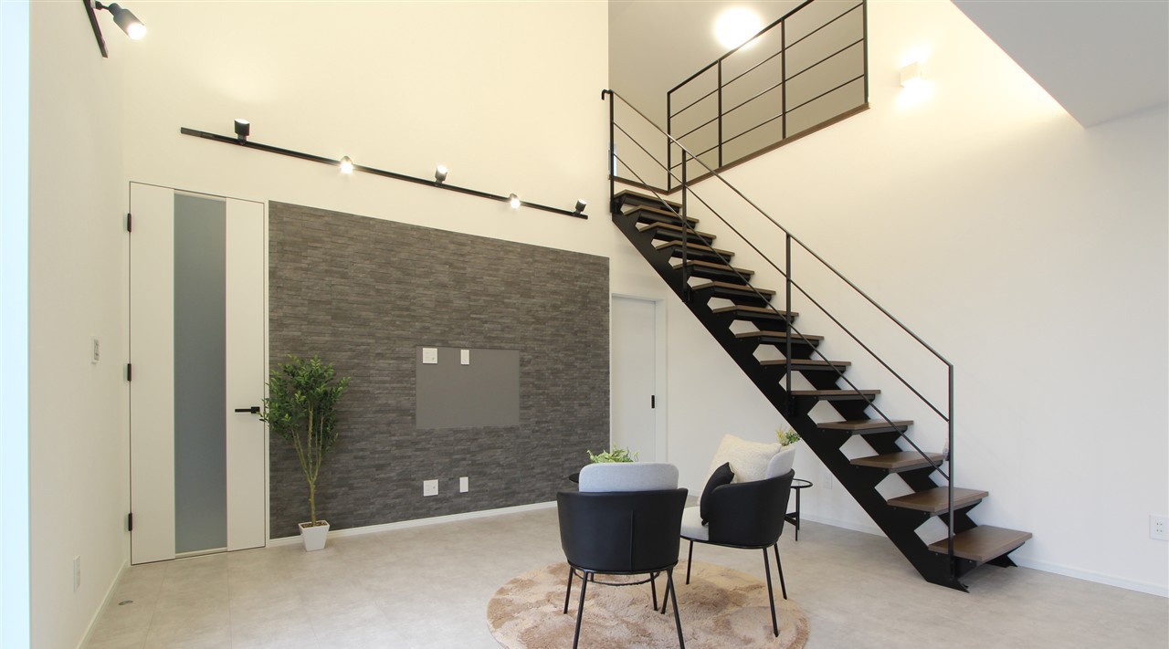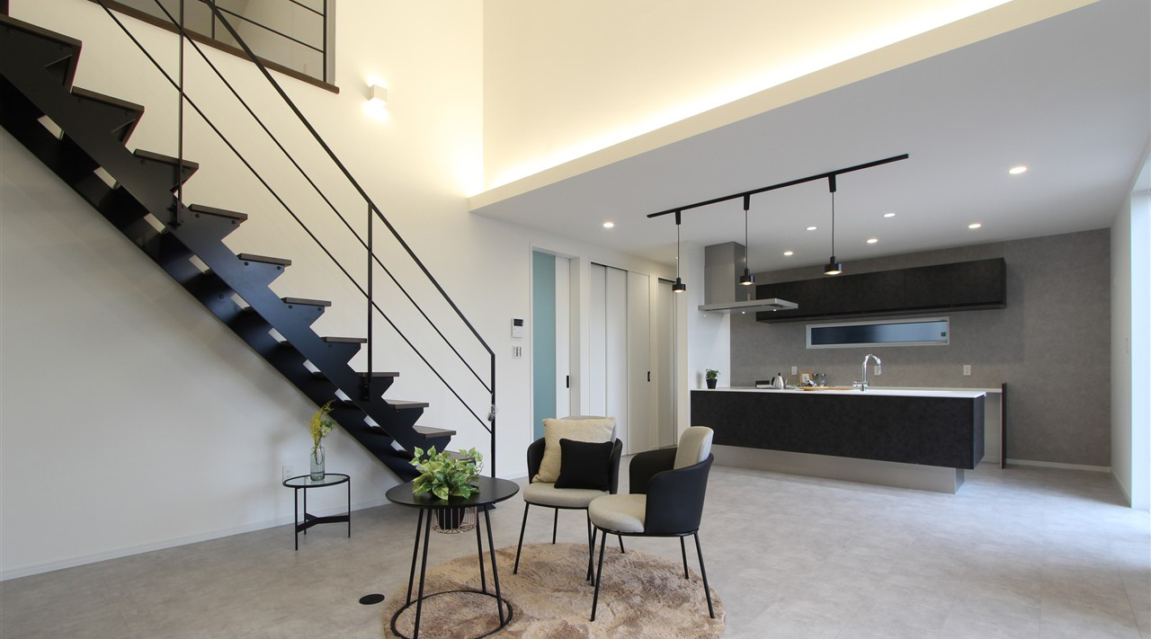 20.8帖の広々としたLDKは、高い天井がもたらす圧倒的な開放感が魅力。キッチンに立ちながら、リビングでくつろぐお子様やウッドデッキで遊ぶ姿まで、家中をぐるりと見渡せる安心感があります。 シックな石目調の床やブラックのスチール階段など、細部までこだわり抜いたデザインに囲まれながら、子育ても、自分たちの時間も、心ゆくまで愉しむ。機能性と審美性を融合した平屋です。